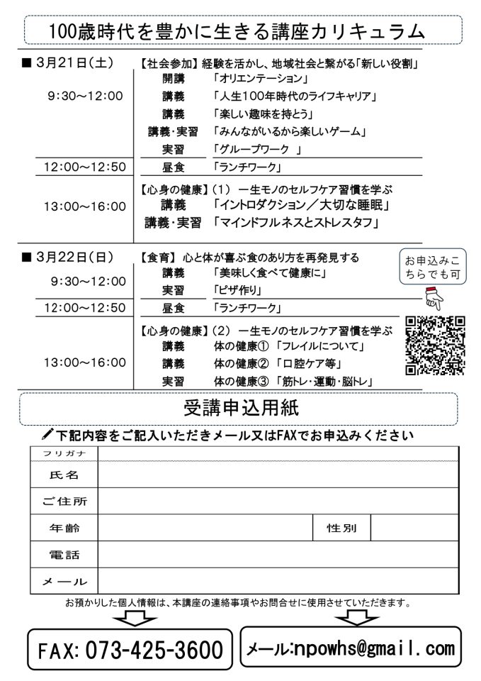 | 備考 | お問合せ:TEL:090-2287-6179(梅本) お申込みMAIL: npowhs@gmail.comFAX: 073-425-3600 |